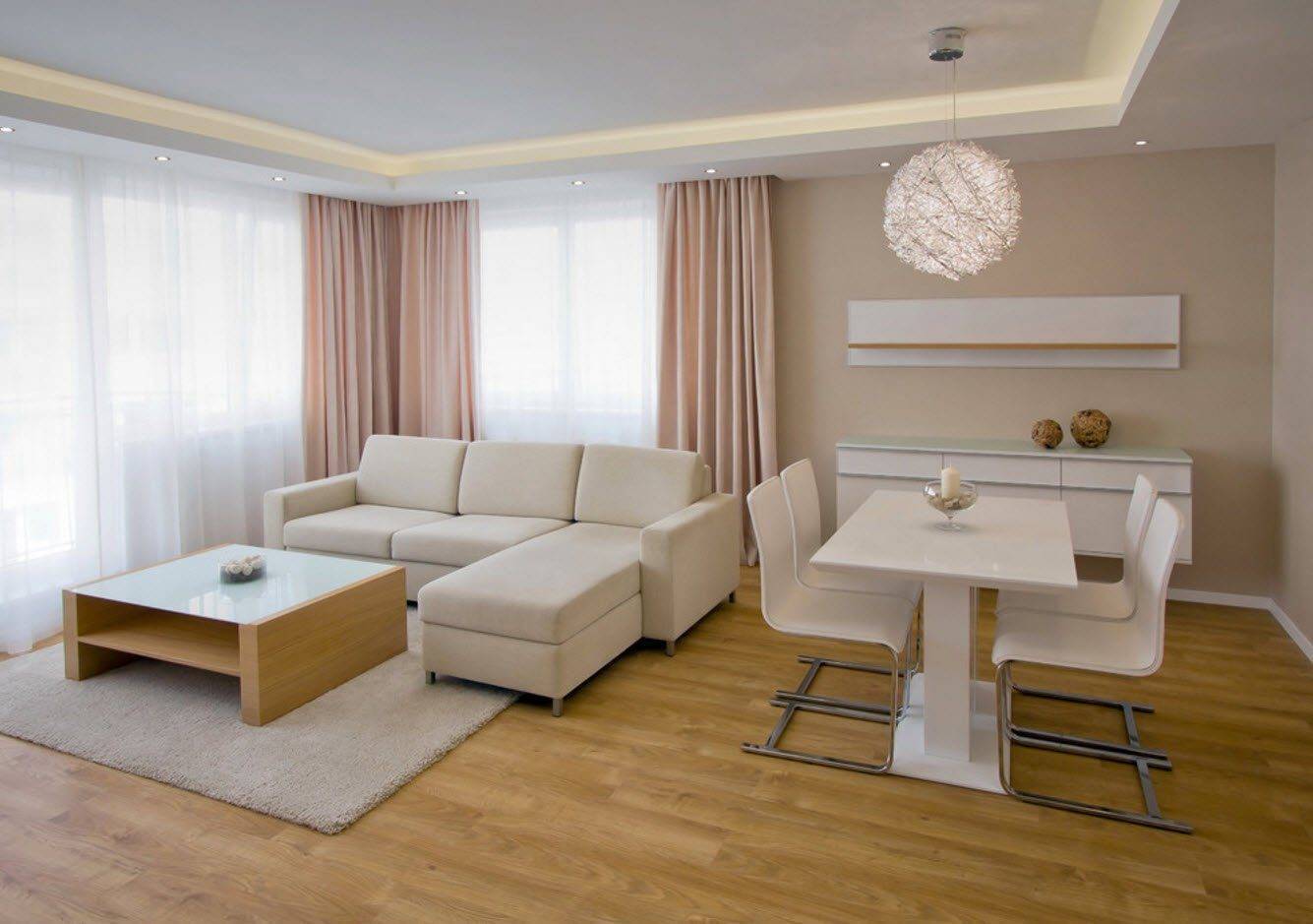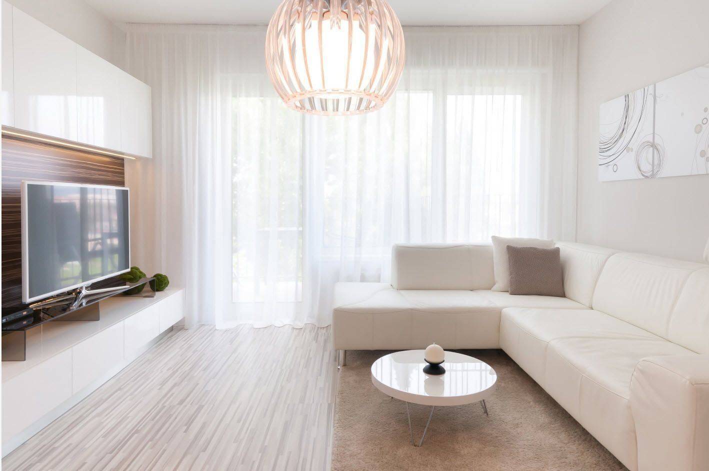 Белый зал — это не только стены и диван в таком цвете. Комната может быть разработана с использованием различных материалов в оттенках белого. Играя текстурами и тканями помещению визуально дополняется площадь измерения, а характер становится интереснее. Пол, выложенный плиткой, окрашенный в белый цвет, отлично сочетается с серым ковром и бежевым диваном. Белая стена — это лишь фон для общего декора комнаты. На потолке могут быть деревянные панели в естественном тоне. Белизна видна также и в выборе текстиля, включая занавески.