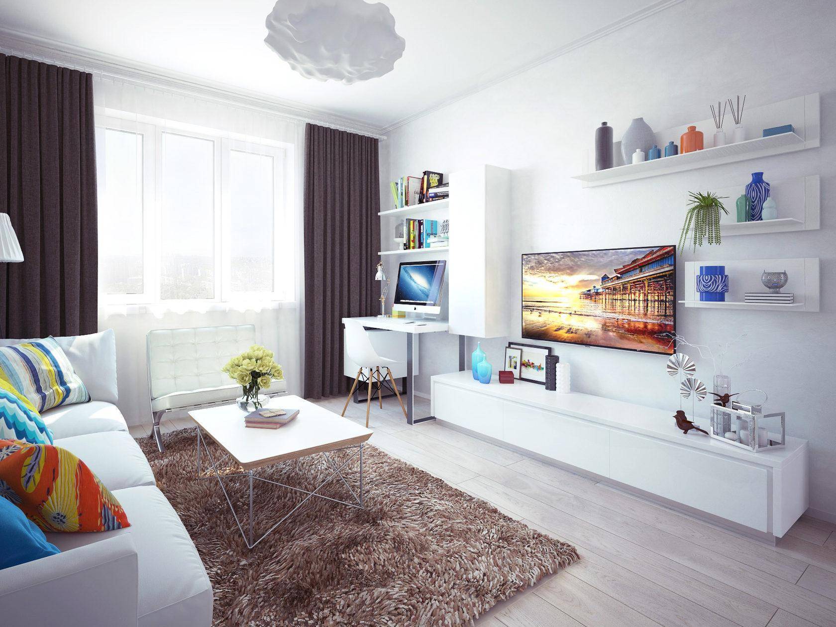 Белая гостиная с красочными аксессуарами