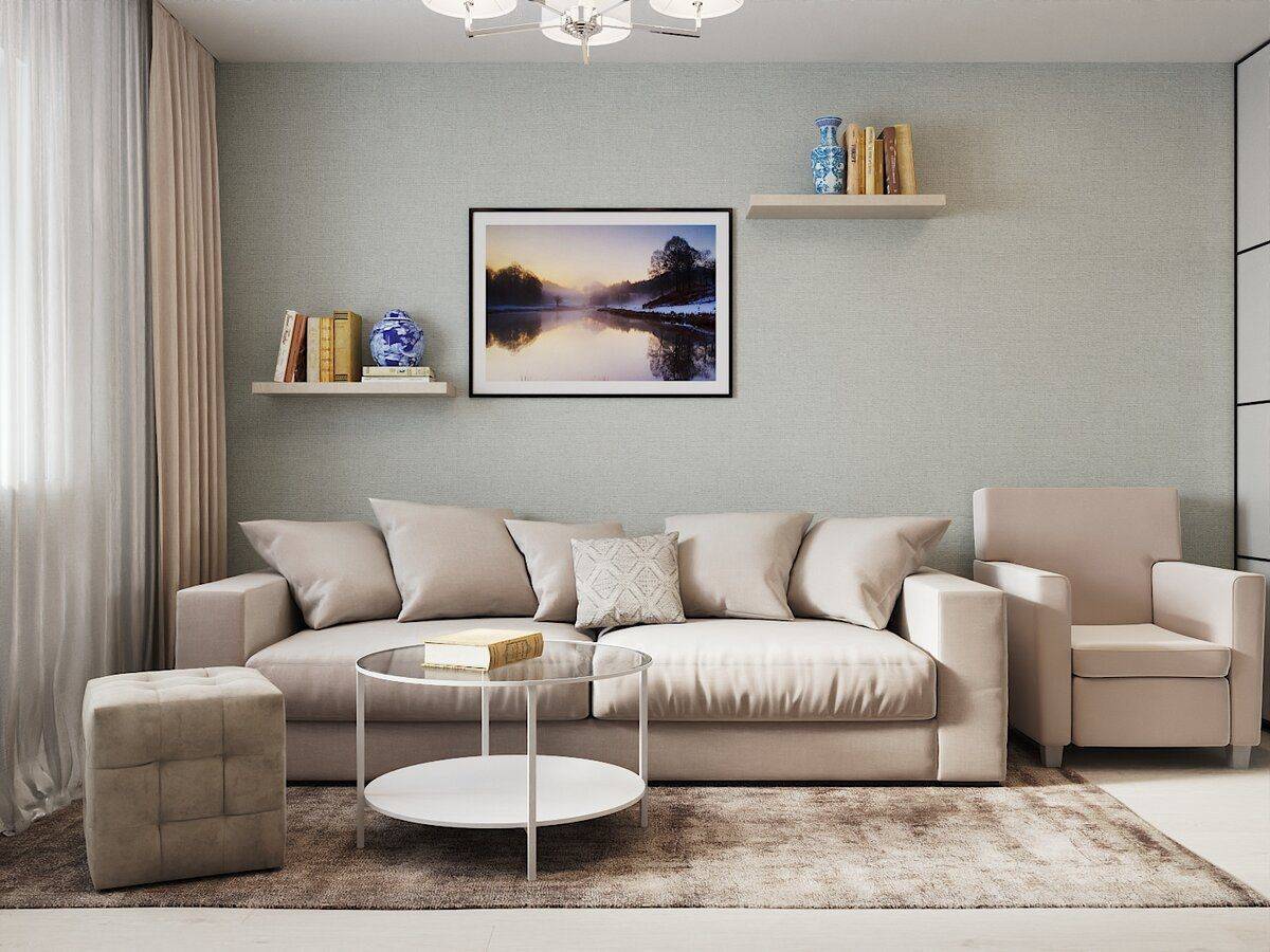если комната хорошо освещена – можете выбрать для фона обои холодной палитры. Такие оттенки особенно популярны в современных интерьерах: к примеру, серый и голубой отлично впишутся в спокойный дизайн гостиной и настроят на отдых.