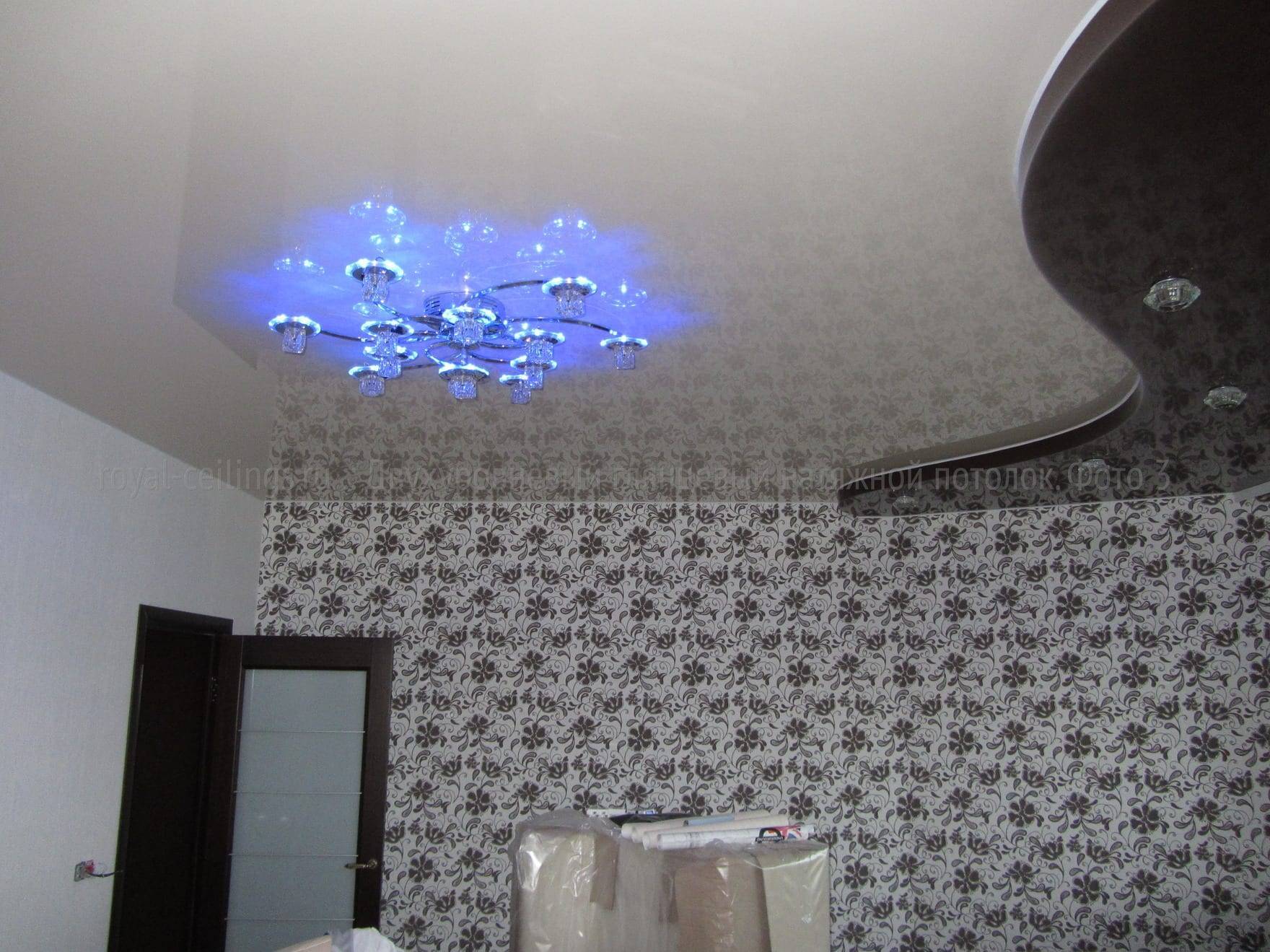 - Возможность установки разных осветительных устройств. С полотнами из поливинилхлорида можно сочетать как люстры, так и точечные осветительные приборы. Ограничение касается только мощности, поскольку, к примеру, лампы накаливания при нагреве могут повредить пленку, поэтому их использовать в качестве дополнительного источника света нельзя. Убрать прожженный дефект будет очень проблематично.