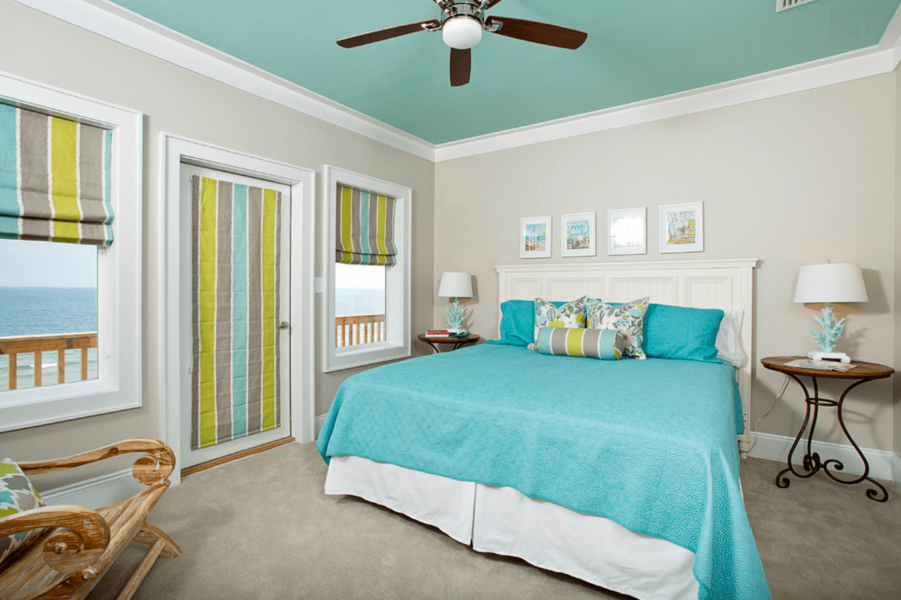 Хорошо подходят голубые, синие, бежевые тона, настраивающие на отдых. Не стоит подбирать яркие цвета или контрастные сочетания. Если хочется чего-то необычного, можно заказать «звёздное небо» или неброскую фотопечать.