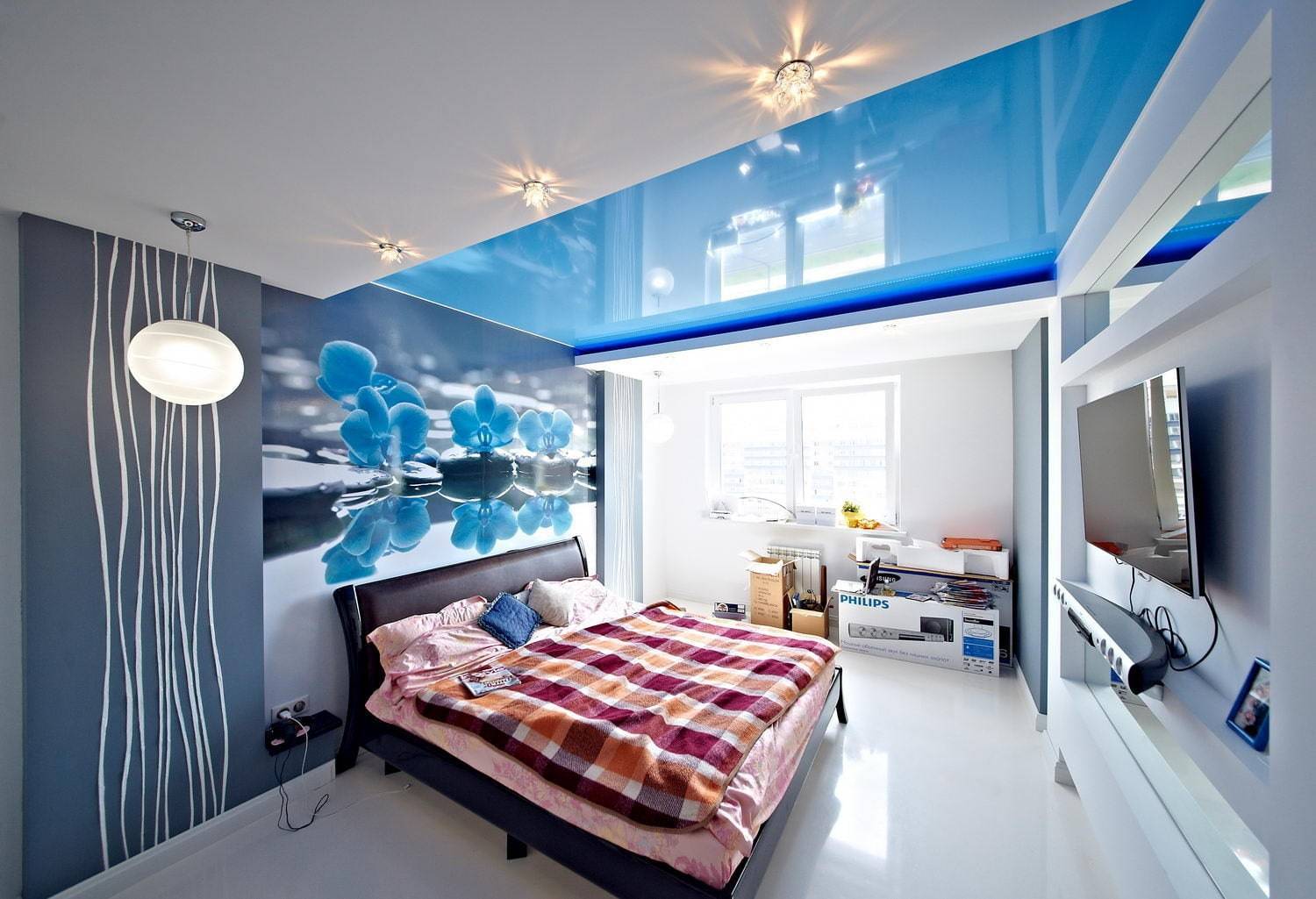 Хорошо подходят голубые, синие, бежевые тона, настраивающие на отдых. Не стоит подбирать яркие цвета или контрастные сочетания. Если хочется чего-то необычного, можно заказать «звёздное небо» или неброскую фотопечать.