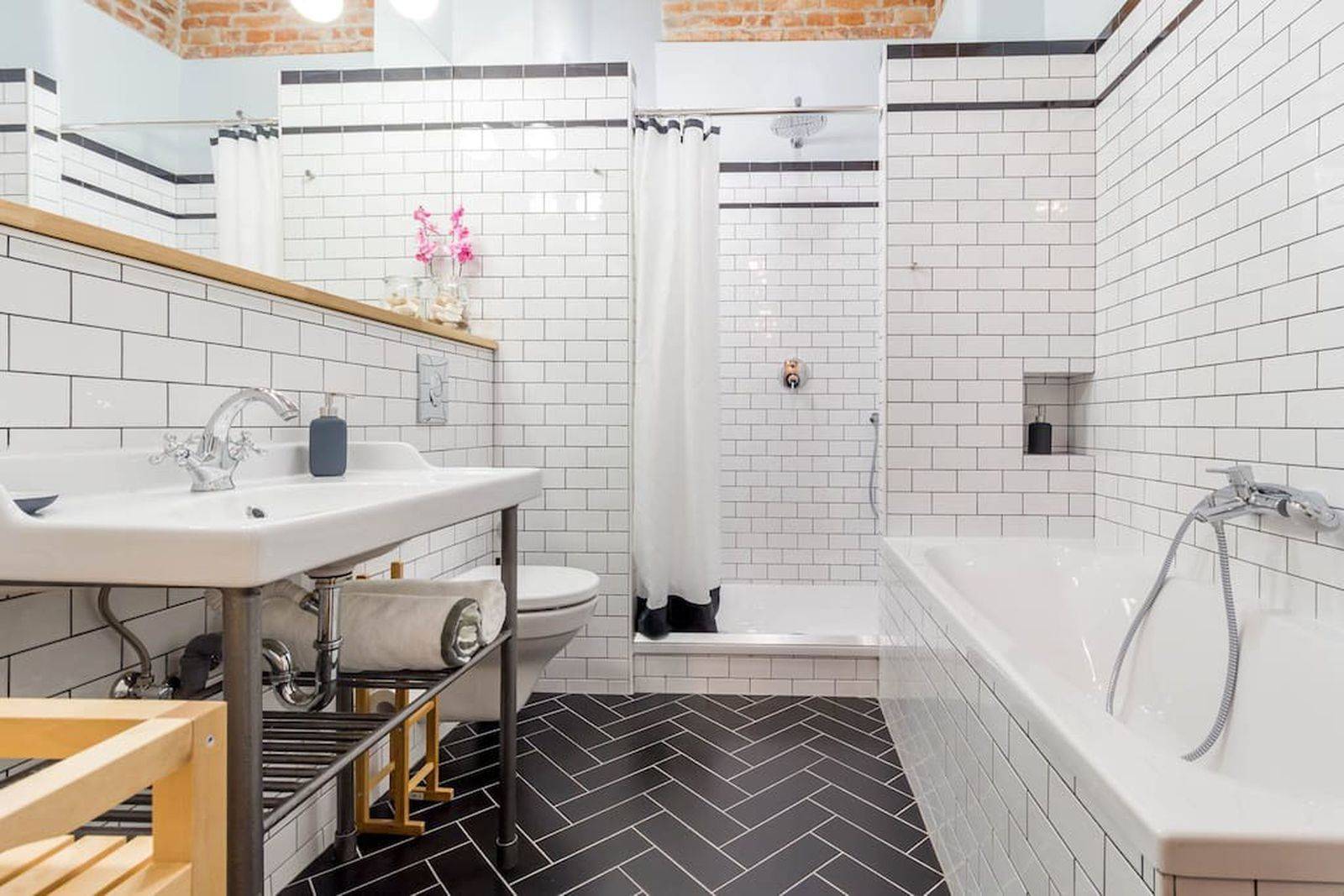 Важно здесь использовать минимализм, по этой причине плитка не должна иметь сложный рисунок, чтобы контрастные швы не смотрелись лишними. Допустимо наличие неярких элементов, например имитация дерева, мрамора и т.п
