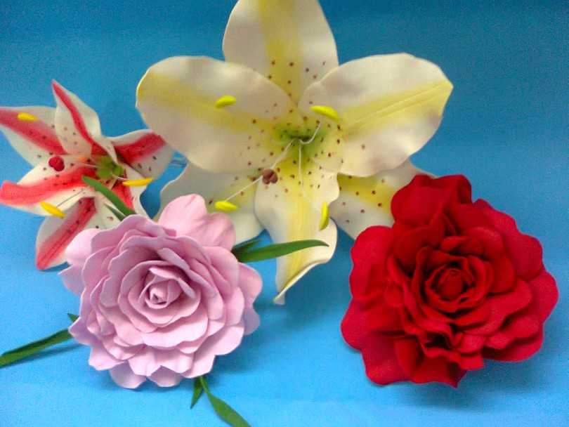 Любые цветы – поделки из фоамирана просто очаровательны. Это могут быть розы, гиацинты, маки, лилии, астры или пионы.