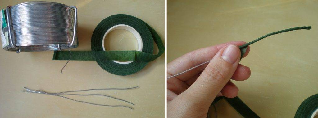 Из зеленого фоама нарезать узкие длинные полоски шириной 0,5-0,7 мм, срезать конец под углом 45 градусов. На него капнуть горячего клея, приложить к проволоке и закрутить по спирали.