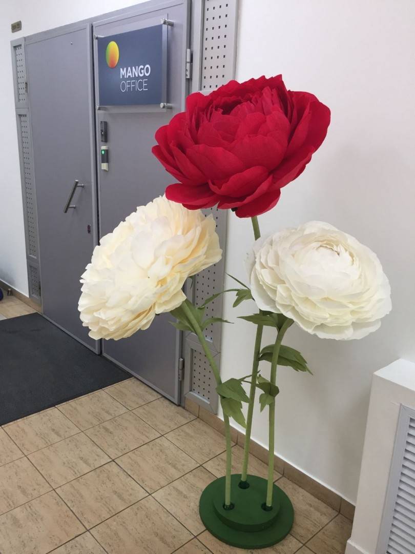 Если перед торжественным событием нужно украсить зал ростовыми цветами, лучше сделать их на ножке. Гигантских размеров розы из гофрированной бумаги будут встречать гостей перед входом. Смотрится ростовые цветы потрясающе, все гости будут в восторге.