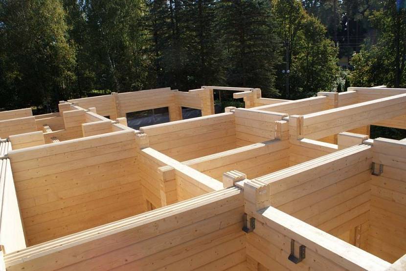 После возведения стен сооружают временную крышу. До установки окон и дверей дом должен пройти процесс усадки. При применении клееного бруса это время сокращается до 6 месяцев. Во время работы необходимо следить за уровнем стен.