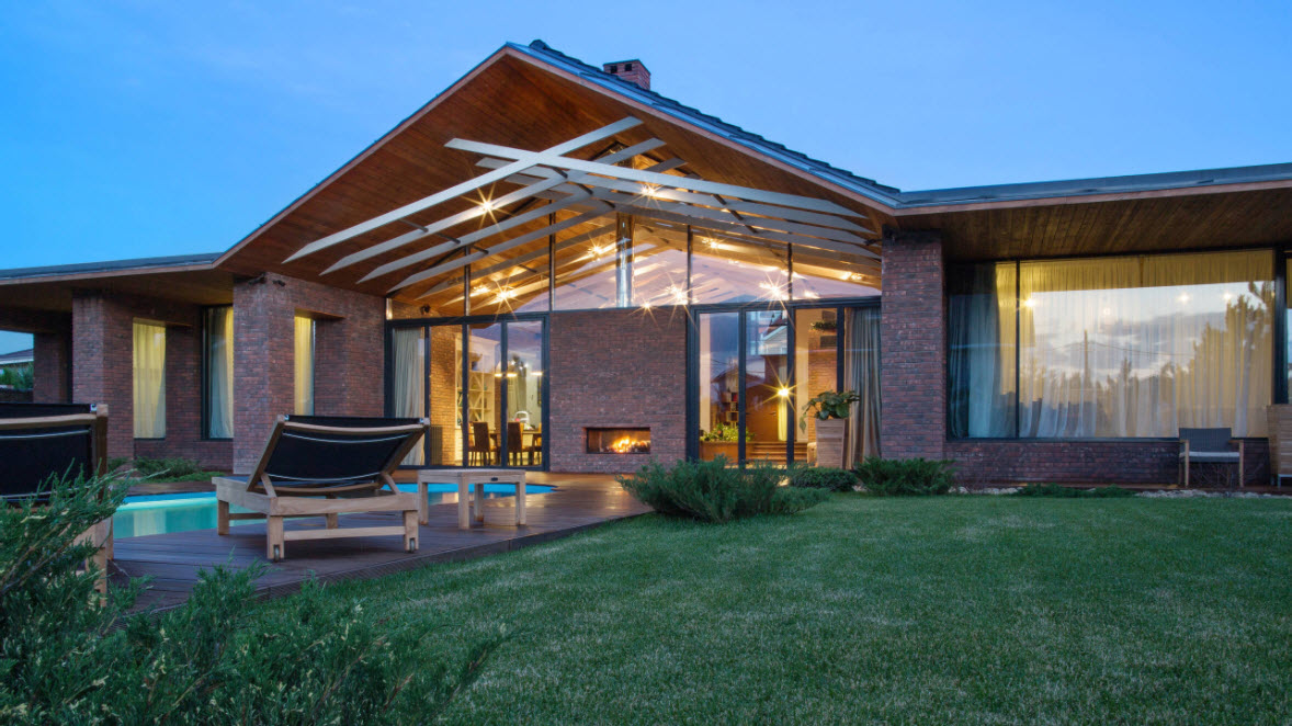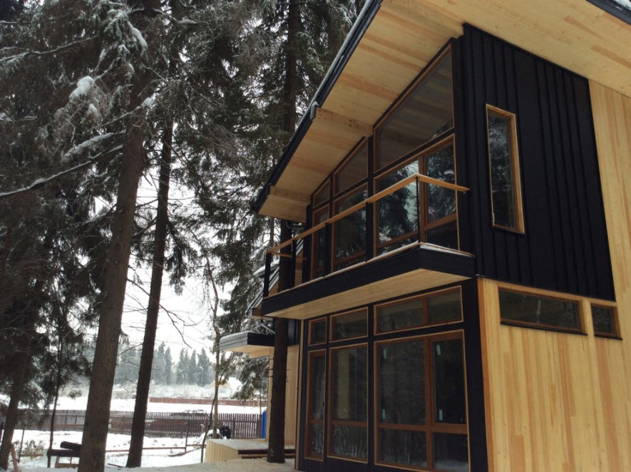 Современный дачный дом можно построить их сэндвич-панелей. Их на стройплощадку доставляют уже готовыми, нужно только собрать.