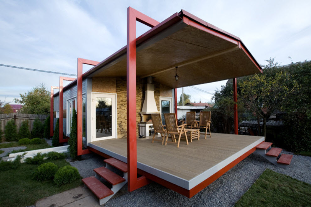 Прицеп можно переобустроить в полноценный и очень комфортный жилой уголок, причем сделать все за считанные месяцы. По проектам, в этих небольших дачных домиках к уже имеющимся 20 квадратам площади предлагается добавить башнеобразную пристройку, на втором ярусе которой расположить балкон. При этом в нижней части получится уютная кухонька.