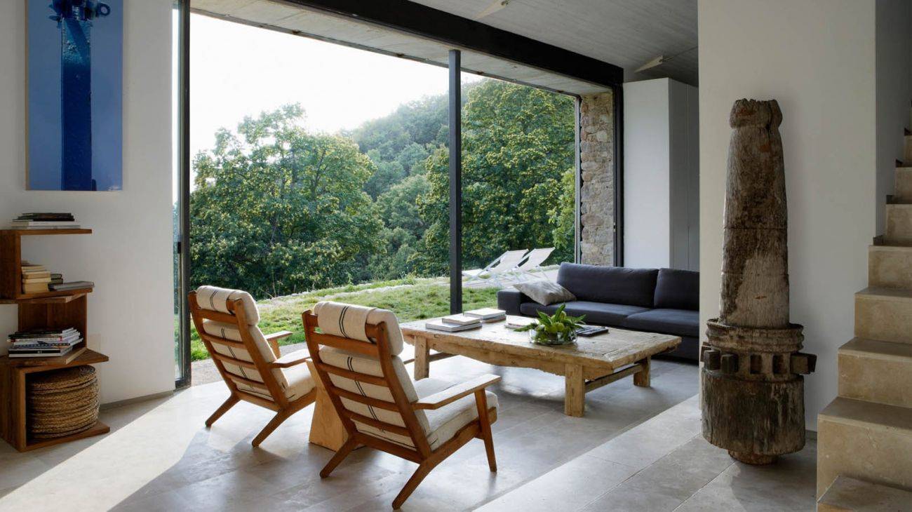 Пожалуй, дизайнеры не придумали лучшего решения, чем вписать интерьер такого коттеджа в окружающий ландшафт. Свежий воздух, водоем, лесной или сельский пейзаж и другие атрибуты жизни за городом идеально сочетаются с такими стилями: