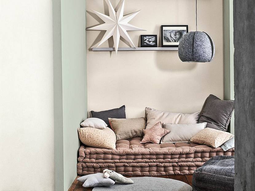 Красивый мятно-зеленый оттенок очень нежный, почти прозрачный, отлично смотрится в любом интерьере. Тон рекомендуют в качестве альтернативы белому или светло-серому на потолке и стенах. Фон поможет создать умиротворяющую атмосферу, настраивающую на общение с близкими людьми.