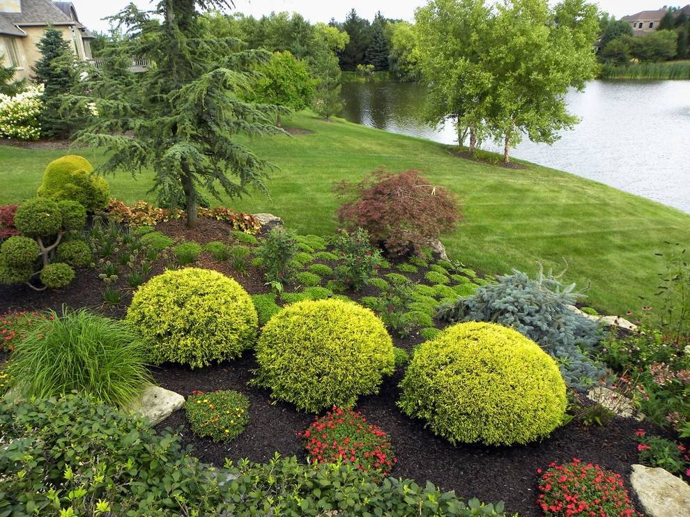 - Выбор доминирующего объекта — определить из уже существующих или создать новый значимый объект, вокруг которого создавать всю декоративную композицию (это может быть высокое дерево, пруд, дом и другие здания).