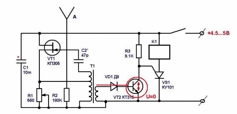 Чувствительность схемы определяется полевым транзистором VT1, которая корректируется переменным резистором R1. На полевом транзисторе собран высокочастотный генератор, частота которого изменяется при приближении крупного предмета, например, человека. В режиме ожидания полевой транзистор генерирует колебания на первичную обмотку трансформатора. Со вторичной обмотки трансформатора эти колебания выпрямляются диодом VD1. При этом напряжение на коллекторе транзистора VT2 равно нулю (показано на вышеприведенной схеме). Данное состояние обеспечивает закрытое состояние тиристора VS1.