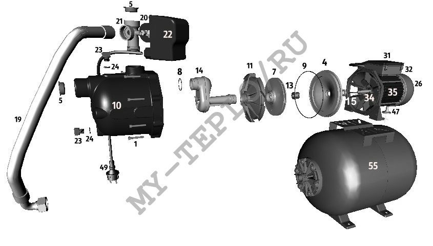 Перед тем, как подключить гидроаккумулятор для систем индивидуального водоснабжения, готовят комплектующие: автоматические приборы, фильтры и переходные муфты для подсоединения труб ПНД. После подсоединения электронасоса к водопроводу из ПНД при помощи переходных пластиковых муфт и размещения его в скважине, дальнейшие работы по сборке проводят в следующей последовательности: