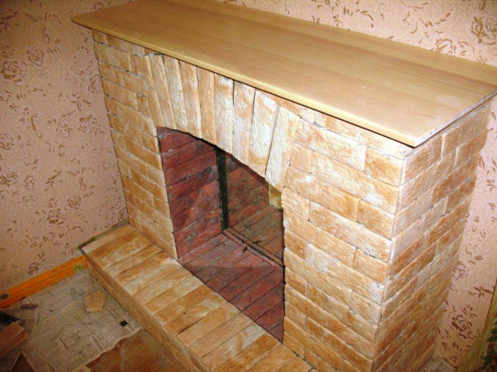 Прикрепляем столешницу к верхней части камина.