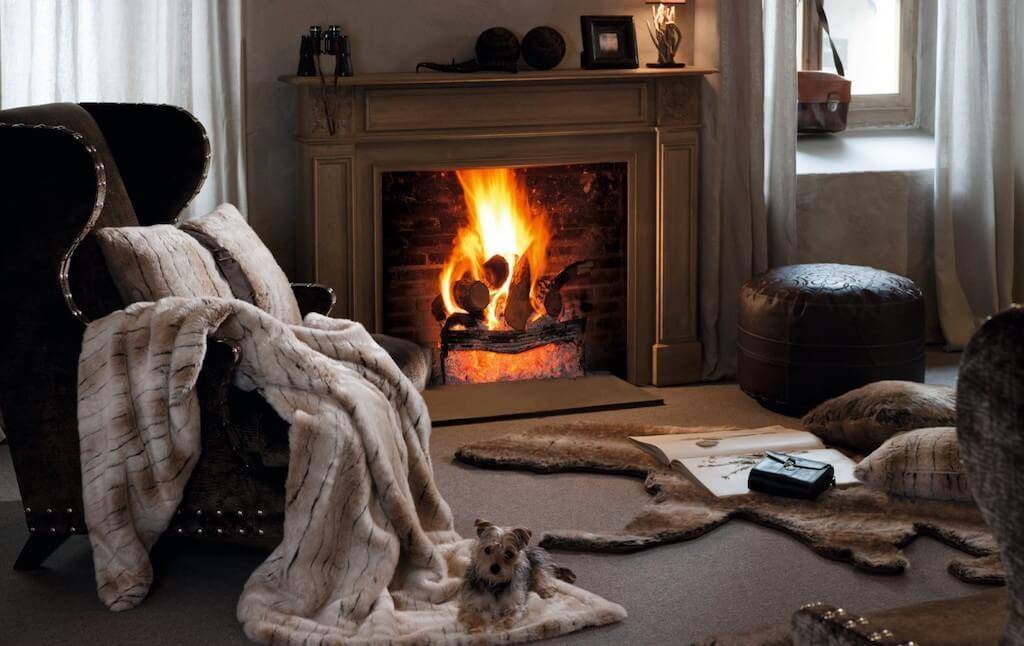 Но на безопасном расстоянии от действующего очага вполне можно расстелить пушистое покрывало, ковер или меховую шкуру. Возлежание возле камина в этом случае может стать изюминкой зимних вечеров.