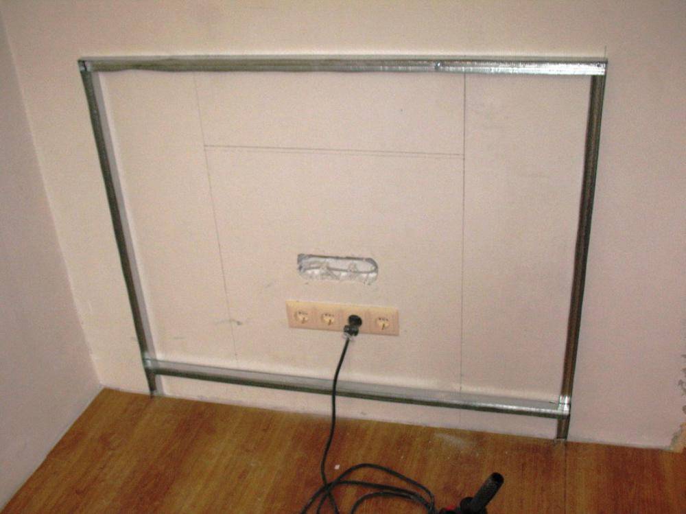 Готовый каркас обшиваем гипсокартоном.