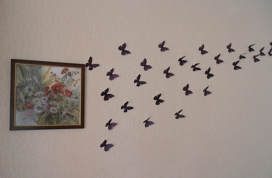 Данный вид декора представляет собой аппликацию или, правильнее сказать, панно из бабочек, выполненных из различного листового материала и закрепленных в изящных аппликациях по всем стенам или же на какой-нибудь одной. Изготовить и закрепить бабочек на стенах можно множеством способов и от того, как это сделать, будет зависеть конечный результат и эффект, который будет производить это украшение.