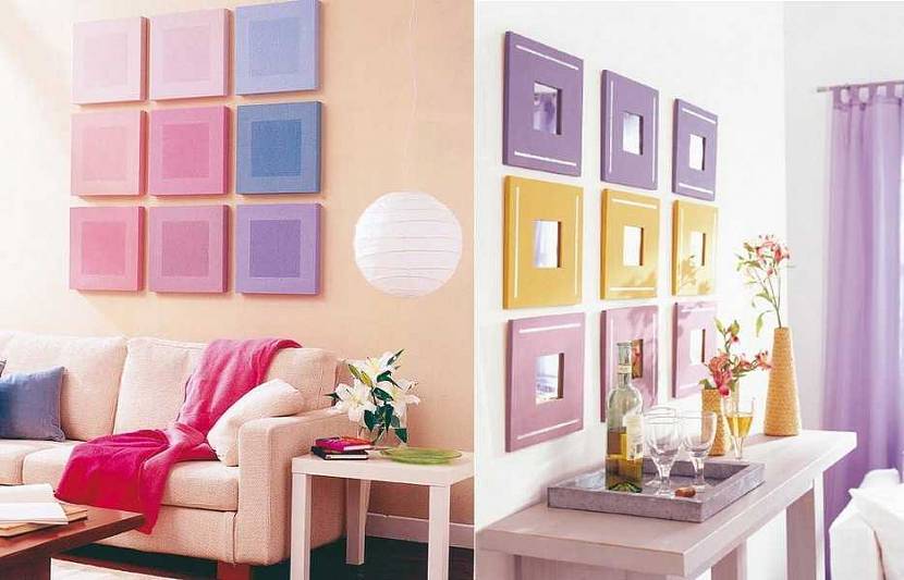 Отличная идея для стиля кантри, классик, модерн. На пустую стену навешивается контрастная рамка, в которую вставляется отрезок ярких виниловых или флизелиновых обоев. Может потребоваться несколько полос материала.