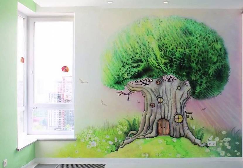 Роспись стен. С её помощью можно добиться как визуального уменьшения, так и увеличения пространства. Этот оригинальный способ декора отлично подойдёт для гостиных и детских комнат. В первом случае следует выбирать абстракцию и цветочные мотивы, а во втором – отдать предпочтение ярким композициям с изображением героев сказок. Завершить интерьер помогут небольшие коврики, цветные подушки и текстиль из натуральных тканей.