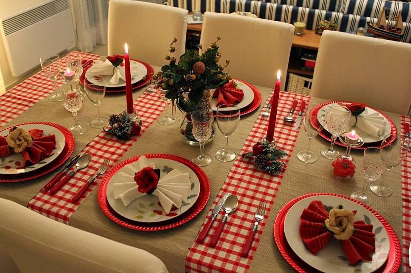 Подготовка стола к небольшому новогоднему застолью в красных тонахИсточник netrs.ru