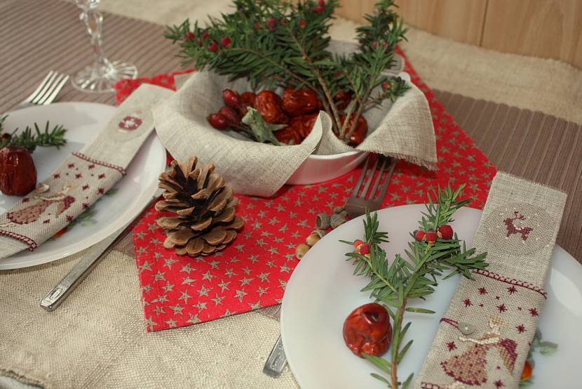 Оригинально смотрится стол, сервированный ярко-алой или бордовой скатертью и зелеными тканевыми салфетками. В бокалы можно конусом вставить бумажные салфетки с изображением новогодних композиций.