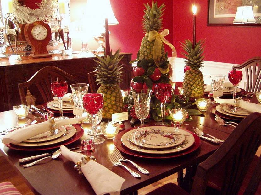 Сервировка стола к новогоднему торжеству с украшением ананасамиИсточник almode.ru