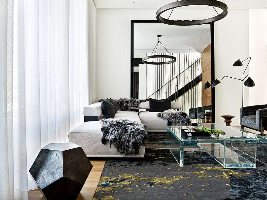 Фото 5. Сочетание двух противоположных цветов – белого и черного – определяет жесткий графичный дизайн гостиной, натуральное дерево пола смягчает интерьер, а шкура на полу придает уют.