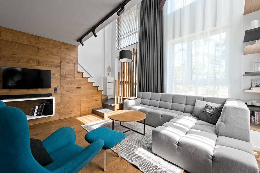 - Светлые (белые или серые) стены, деревянный пол, деревянные панели на стене в качестве условного элемента зонирования.