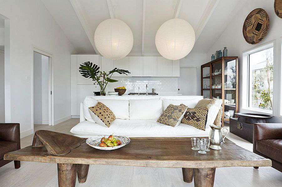 Белая отделка и минимальный набор мебели и предметов декора позволит сделать просторный и комфортный дом. Обязательно наличие в нем хорошего освещения. Обеспечить его помогут торшеры, стеклянные прозрачные плафоны на стене.