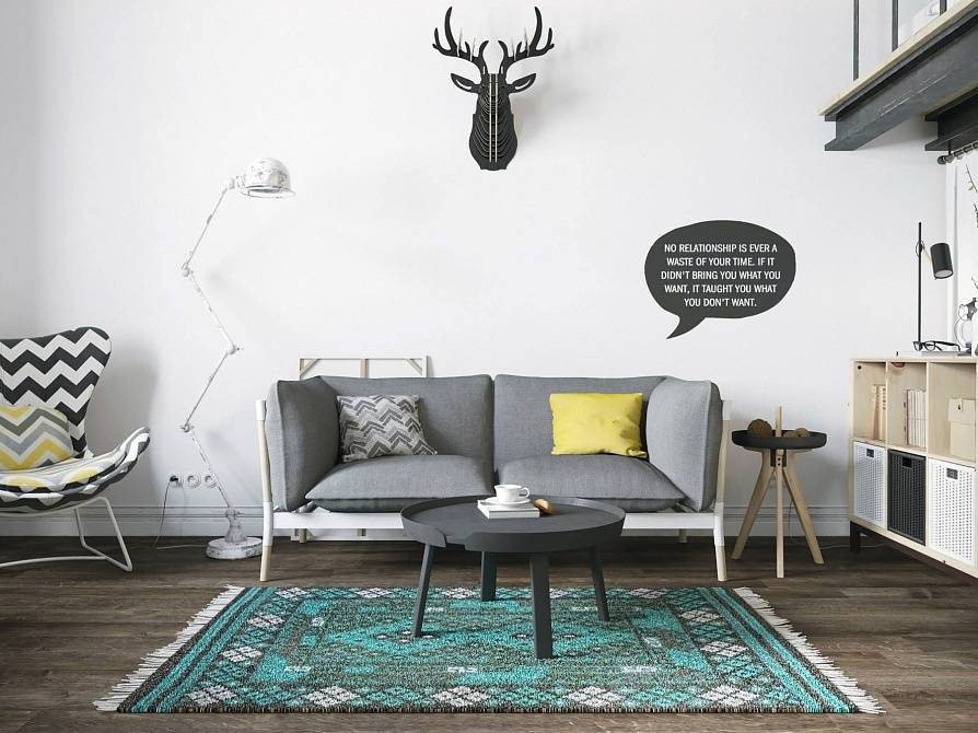 Пол могут украшать пушистые однотонные коврики либо дорожки с ярким геометрическим рисунком.