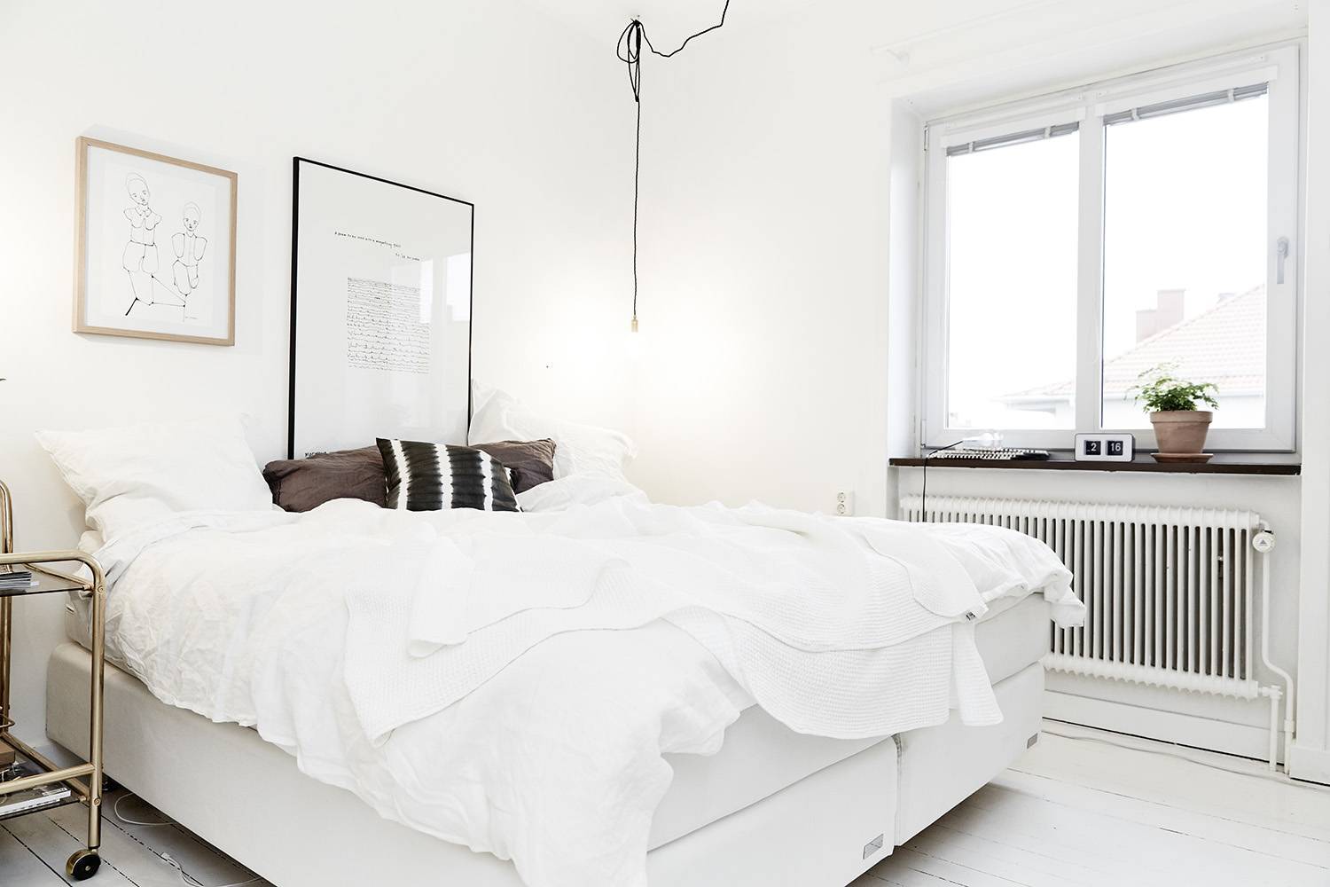 Фото 2. В лаконичном дизайне белой скандинавской спальни акцентная стена у изголовья выделена белыми досками.