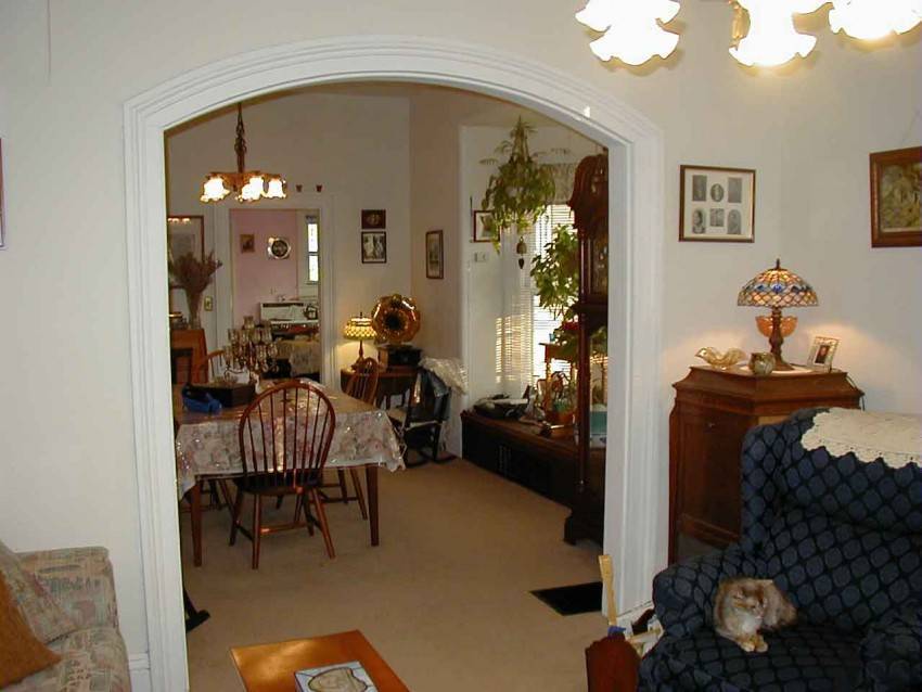 На фото каменный арочный проход в столовую. Натуральная отделка украшает не только проем, но и часть стены вокруг него.