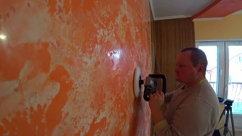 Финишный слой до конца не досушивается. Через полчаса венецианской кельмой проводят железнение. Поверхность заглаживается по кругу, пока не проявится рисунок. При этом образуется блеск и появляется глубина. А сформированная слоистость повторяет натуральность мрамора.