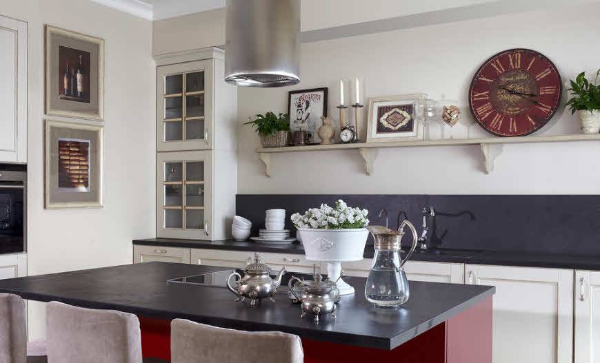 Аксессуары для кухни составляют практически нескончаемый ряд. Для декора могут быть использованы деревянные аксессуары, картины или целые экспозиции. Здесь нужно отметить, что в последнее время все большей популярностью пользуются модульные картины. Интересным элементом декора будут являться цветные выключатели и розетки. Различного рода наклейками можно оживить «серые» места комнаты, придав им красок и настроения. Часы могут стать отличным дополнением дизайна любой комнаты и кухня здесь не исключение. Яркие с красивыми циферблатами часы станут хорошим дополнением в деле отделки стен комнаты. Сейчас можно изготовить часы с любой фотографией, распечатанной на холсте и используемой как фон циферблата. Полки могут нести не только практическую миссию, но и эстетическую. Они могут быть изготовлены из резного дерева, кованного железа, стекла или же обыкновенного пластика.