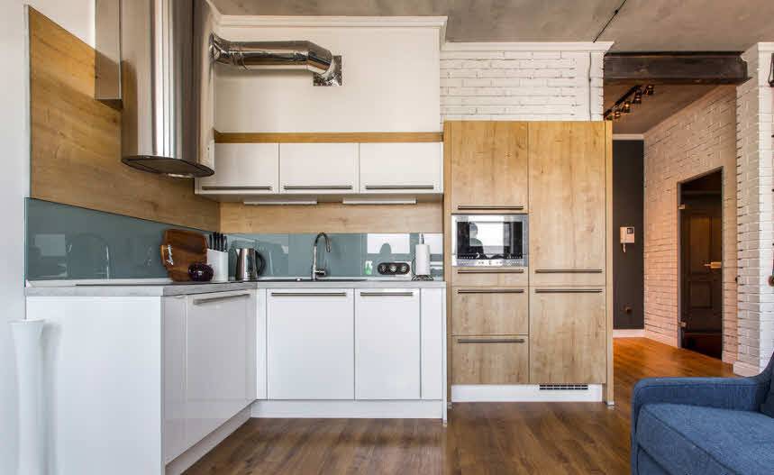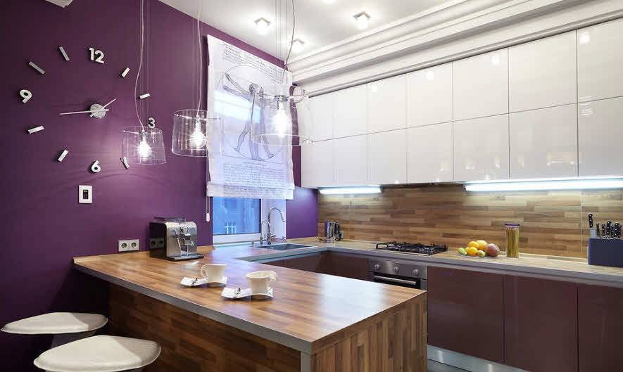Стены кухни не рекомендуются окрашивать в серый, черный и синий. Последний обладает успокаивающим и расслабляющим эффектом, поэтому он больше подходит для таких комнат, как спальня. Однако, если в подобной расцветки сделать только рабочую зону над плитой, а фасады шкафов выбрать в светлых нейтральных тонах, то может получиться замечательный дизайн интерьера.
