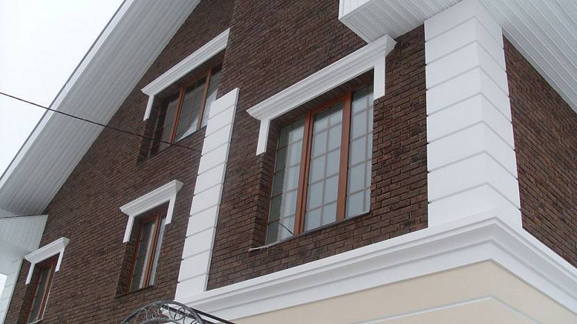 Многообразие выбора декора для фасада из пенопласта позволяет превратить обычный дом в элегантный коттедж, построенный по архитектурному проекту XIX века. Из наиболее востребованных декоративных элементов можно отметить такие: