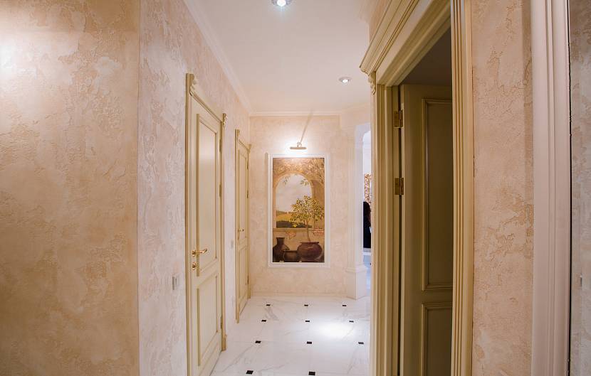 Для оформления узких комнат нельзя использовать контрастные и агрессивные узоры. Поверхность стен должна быть более или менее однородной. Полное отсутствие текстуры отрицательно сказывается на общем впечатлении (на гладкой поверхности хорошо видны пятна, трещины и сколы). Стильный и практичный дизайн помогает получить именно декоративная штукатурка – коридор, отделанный ею, выглядит эстетично. Фактурная поверхность со временем не дает сколов и трещин, не осыпается, ее цвет не выгорает. Прочность – не единственное преимущество материала.