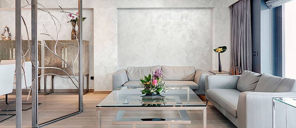 Венецианская штукатурка в интерьере гостиной сегодня признана самой популярной. Она используется для имитации мраморной плитки и рисунков дорогих горных пород. Материал гармонирует со множеством других поверхностей.