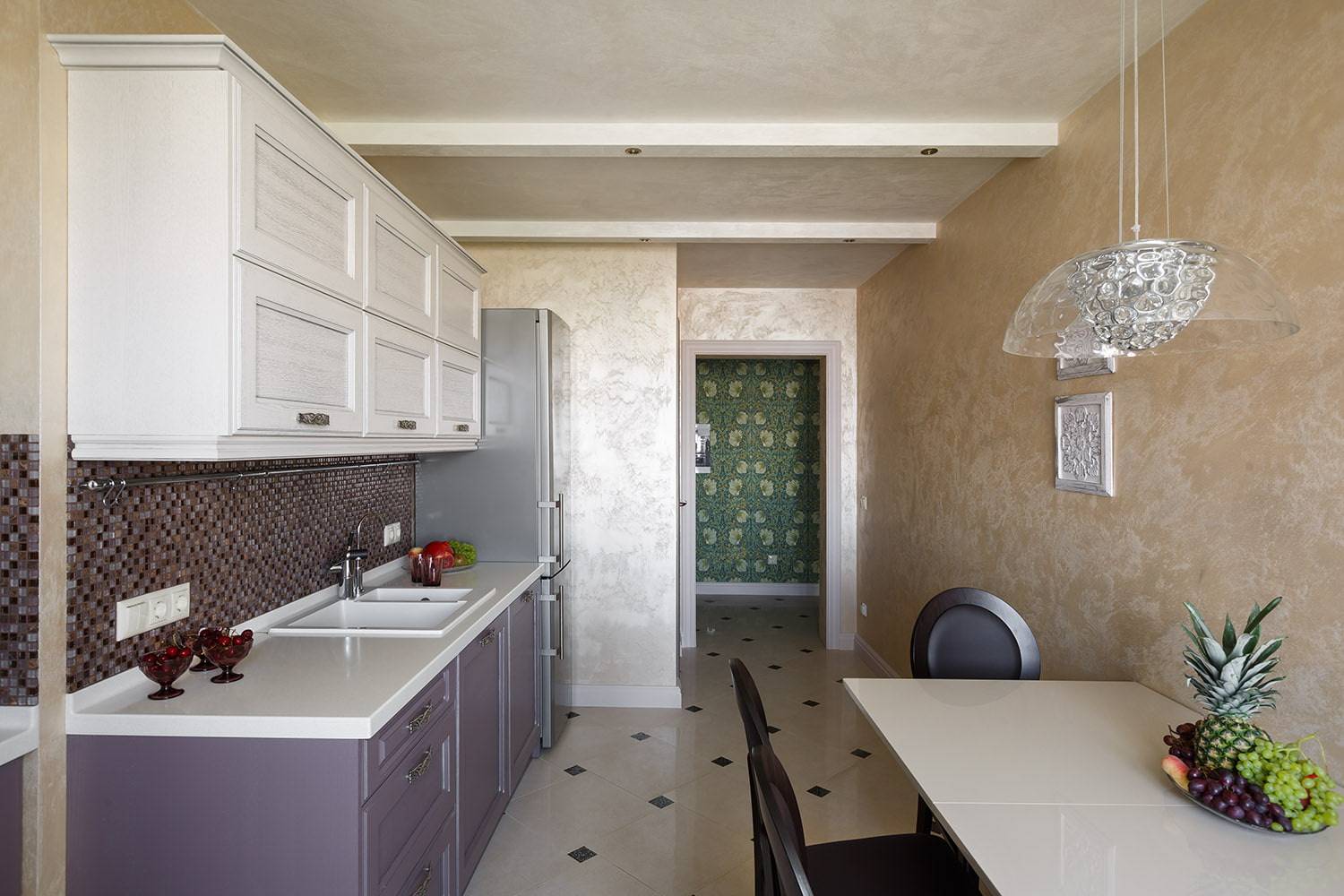 Яркий декор создается при помощи венецианской штукатурки. Ее применяют как в классических, так и в современных интерьерах. Такое оформление только подчеркнет индивидуальность интерьера кухни и самого владельца.
