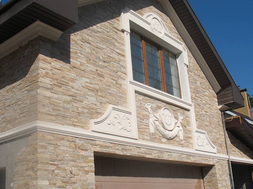 - Прочие декоративные элементы: розетты, балюстрады, балясины, краеугольные или замковые камни, имитация популярных отделочных материалов.