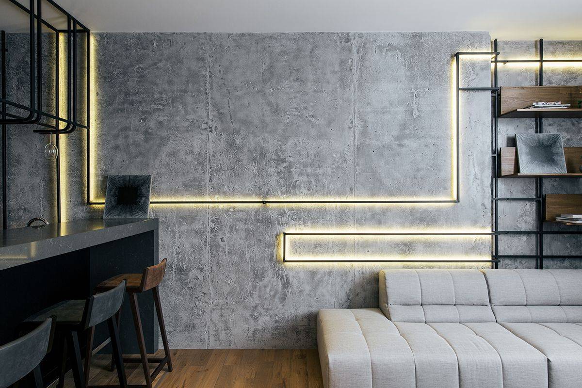 - Имитацию бетона можно вписать в любой интерьер.