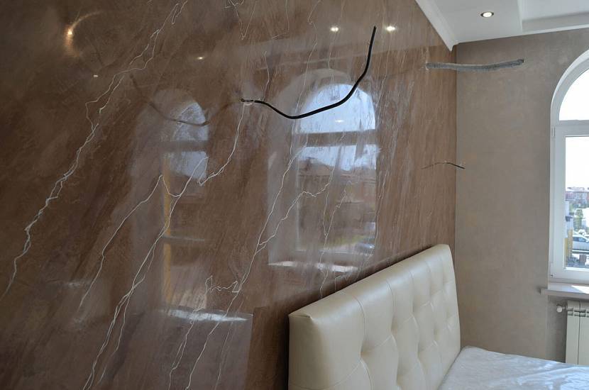 Глянцевая мраморная штукатурка на стенах гостинойИсточник odnastroyka.ru