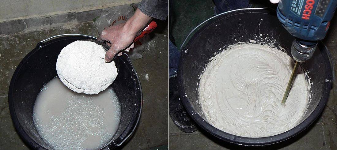 Мастера рекомендуют вначале смешивать сухие компоненты, и только после этого добавлять жидкие. Если в смесь добавляется клей ПВА или другие жидкие компоненты, их вначале разводят с водой в той емкости, где будет замешиваться раствор.
