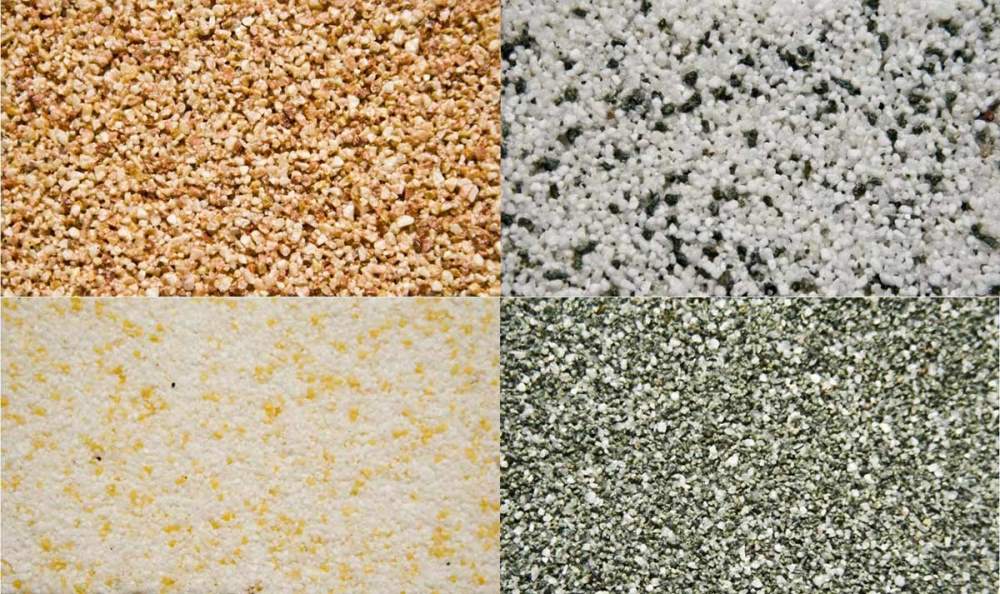 - В минеральные материалы, где основу составляет гипс, известь или цемент, добавляется каменная крошка, песок, каменная мука, мелкие частицы природных минералов, травертин, крошка из ракушек.