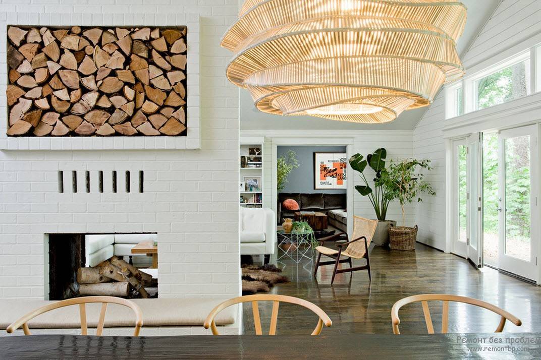 А можно создать деликатный и экологичный интерьер в скандинавском стиле, где мебель имеет преимущественно прямоугольную форму и простую конструкцию, с предметами из плетеного ронатга, веревки, дополнить интерьер акцентами из натуральных элементов (лен, хлопок, натуральные шкуры, дрова для камина) – как результат, хозяин такого жилища получает уютное, наполненной теплом и умиротворением «убежище».