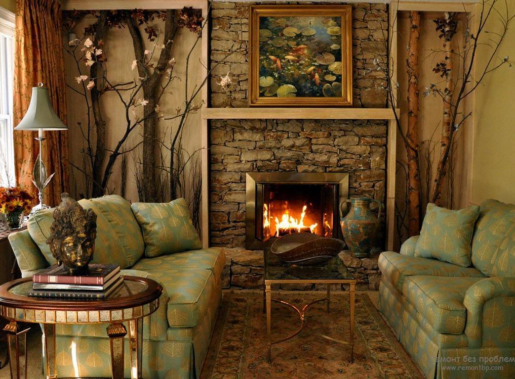 И в этих стилях природным материалам отводится основная роль. На сайтах представлено много фото отделки деревом гостиных в деревенском уютном оформлении. Для таких интерьеров характерны напольные покрытия из массивной доски, отделка стен имитацией бруса, мебель с филенчатыми дверцами, открытыми полками. Вычурной позолоты на предметах нет, но резьба может являться достойным украшением.