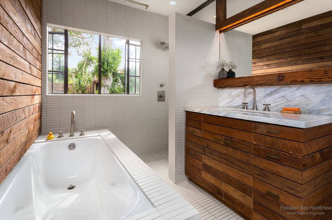 Стильно и вполне уместно смотрится даже деревянная мебель в ванной комнате.
