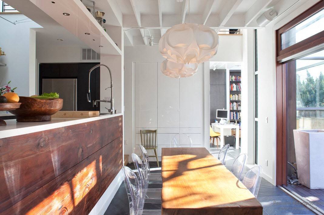 Благодаря профессиональной дизайнерской работе сочетание даже устаревшего дерева с изящными светильниками и модной мебелью, не вызовет недопонимания и дискомфорта для зрительного восприятия.