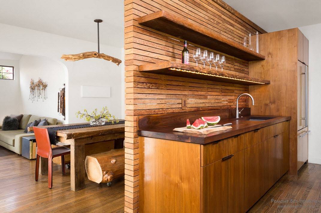 Кухни, столовые – это зоны, где человек получает удовольствие от пищи, отдыха и общения в семейном кругу. Именно здесь, как нигде, хочется наполнить интерьер атмосферой уюта, тепла и гармонии. Дерево – единственный материал, который идеально справиться с поставленной задачей. Причем его можно использовать совершенно по-разному.